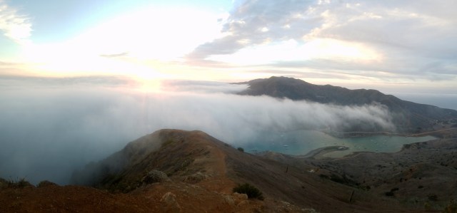 Gabert here, being forced to schwing some blog action. Yesterday, after motoring roughly 11 hours across dead glass ocean, the jagged cliffs of Catalina island materialized out of the grey sky. The northwest side of the island juts straight out of deep ocean, strikingly resembling a huge gorilla. Steep talus fields comprise a majority of the island’s coast, rising hundreds of feet straight up into the fog.